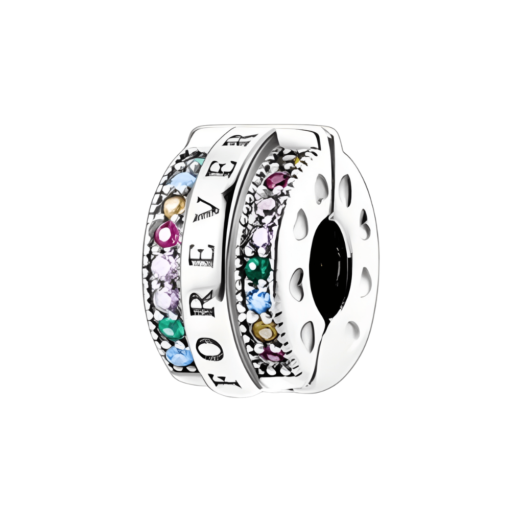 Сребърен клипс от проба S925 с надпис „FOREVER“ и инкрустирани многоцветни камъни от цирконий. Подходящ за фиксиране и акцент на гривна.